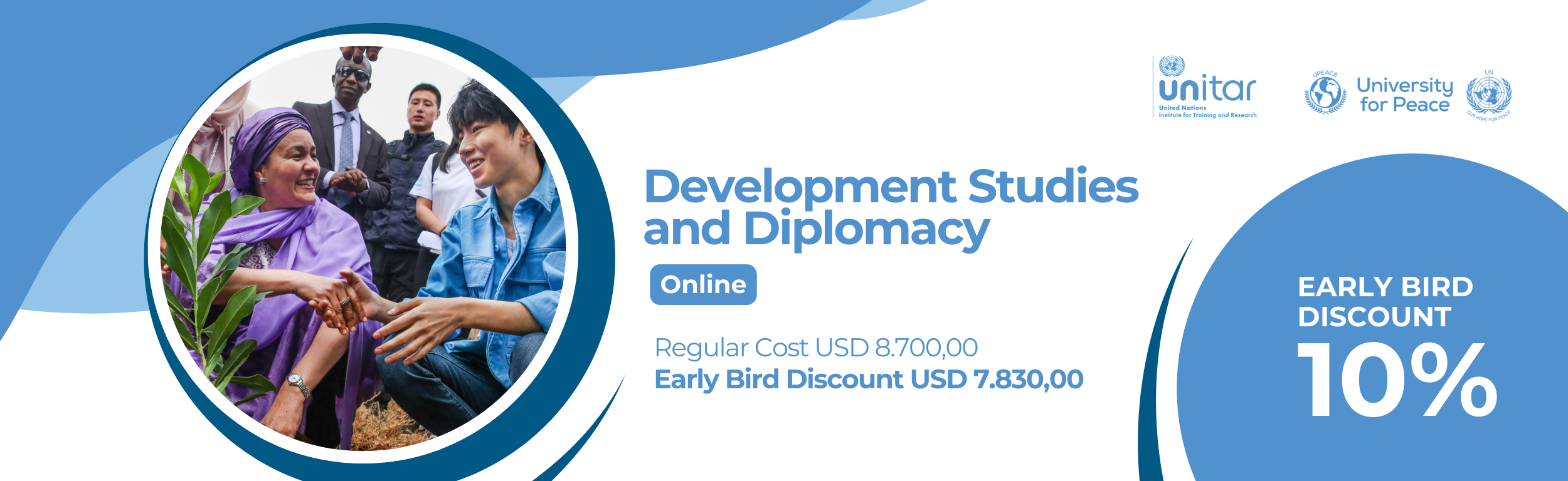 The Master of Arts in Development Studies and Diplomacy (online), offered by UPEACE in partnership with the United Nations Institute for Training and Research (UNITAR), is an interdisciplinary and holistic programme that will broaden student’s knowledge in the field of development studies, sustainability, and diplomacy, and equip them with the required soft skills for a successful international career in any of these areas of expertise.